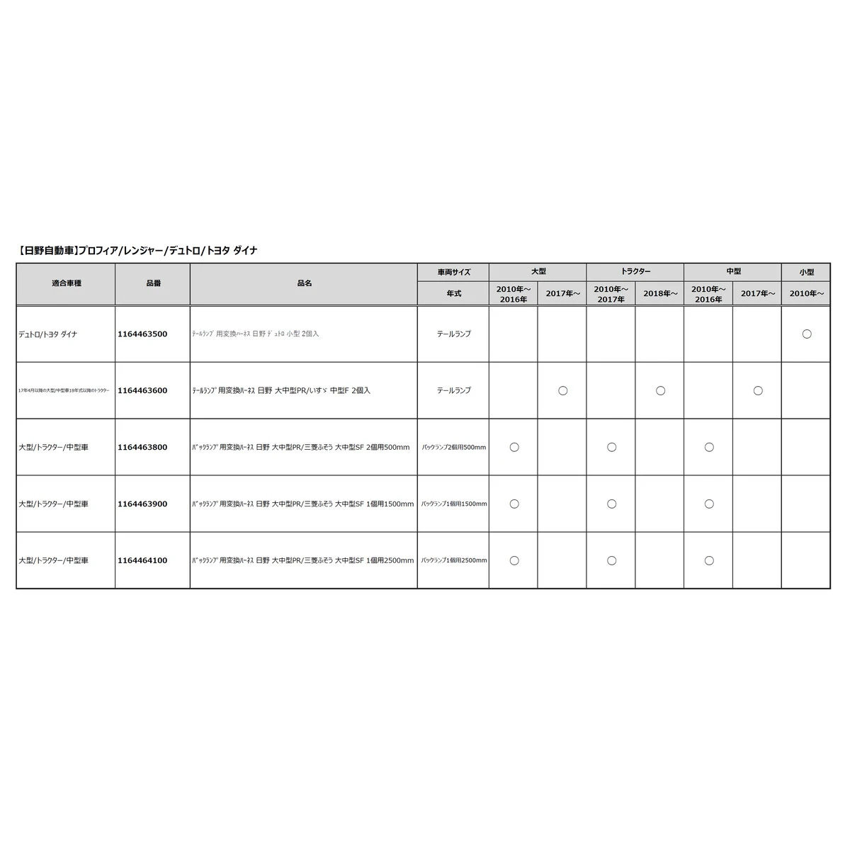 | テールランプ用変換ハーネス 日野 プロフィア いすゞ フォワ―ド | 1164463600 | ハーネス/150mm | プロフィア、フォワ―ド | 日野、いすゞ | 3,900円(税別) 4,290円(税込) | |