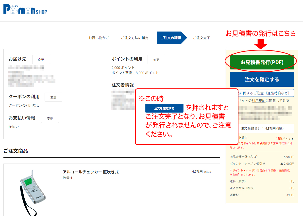 この時、注文を確定するボタンは押さないでください。ご注文が完了し、お見積書は出力されません。